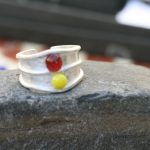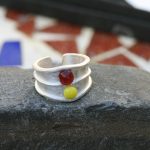 Sterling silver ring handcrafted on the Wild Atlantic Way and set with two glass studs in a lemon yellow shade and a translucent ruby red created with sand from the beaches of the West coast of Ireland.